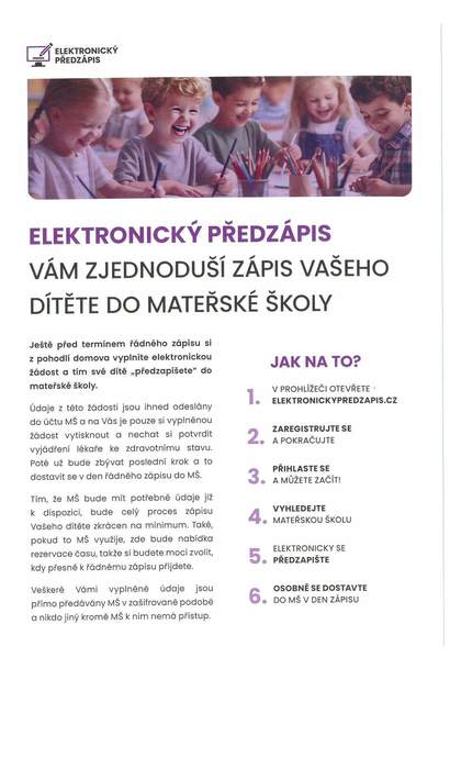 pro usnadnění a urychlení zápisu Vašeho dítěte do naší mateřské školy můžete využít Elektronického předzápisu. Na webu: www.elektronickypredzapis.cz stačí vyhledat naší mateřskou školu, zaregistrovat se a předzapsat se do ní. Je také možno využít přímý odkaz na informační stránku naší mateřské školy: