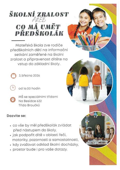 Zveme rodiče předškolních dětí na informační setkání zaměřené na školní zralost a připravenost dítěte na vstup do základní školy.